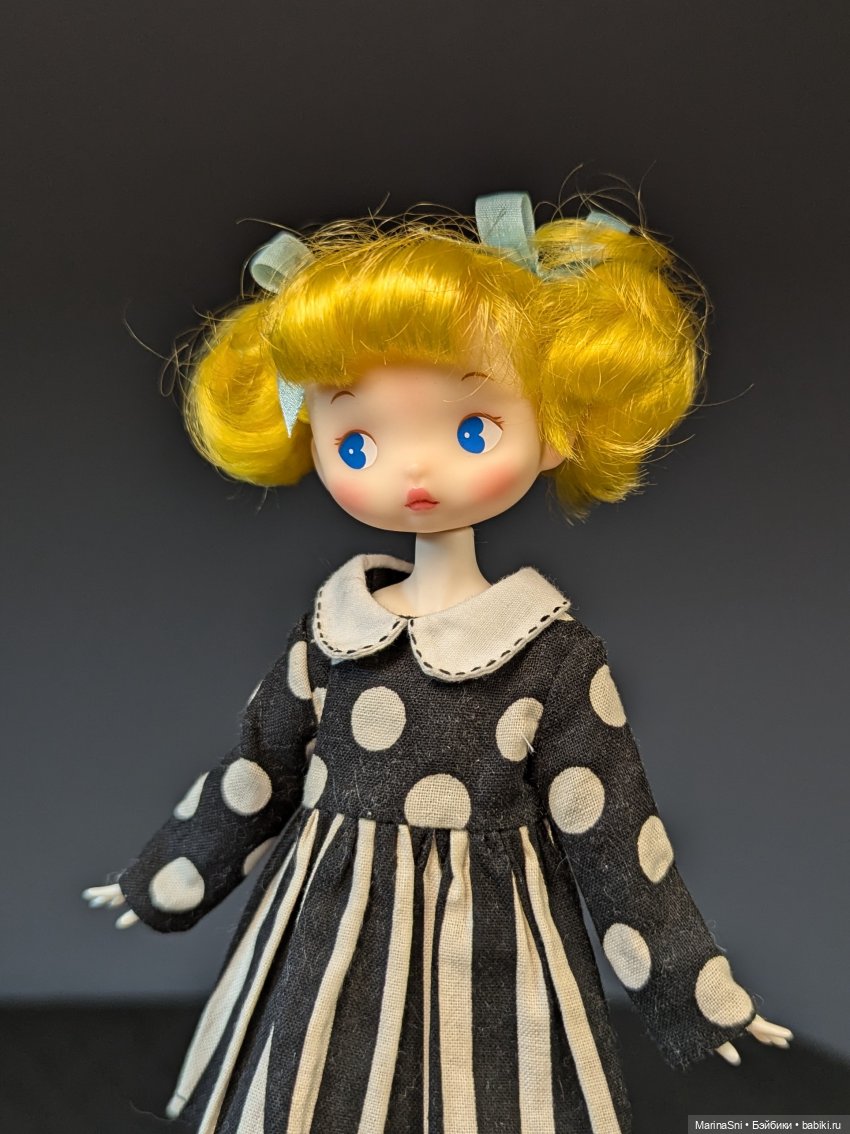 Недавно ко мне приехала очаровательная кукольная головушка. Обожаю яркие жёлтые волосы и хочу собрать небольшую команду желтеньких девочек, поэтому над покупкой особо не думала. А когда получила долгожданную посылку, оказалось, что подходящего тела для нее у меня нет. В аккаунте авторов эта куколка была в формате ob11: