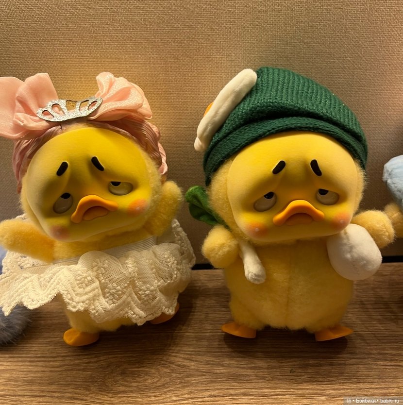 У нее было кривовато приклеена мордочка. Я все думала как это поправить… а когда мне попалась повторка, попробовала в магазине поменять балеринку на кого-нибудь с витрины))). И о чудо! Они вообще были не против. Разрешили выбрать любого( я взяла с черной шапкой, но на витрине было очень мало утят). Жалею, что не взяла с шапкой-желтой рыбой и с цветочной шапкой, там мордочка супер! Но я это не разглядела сразу.