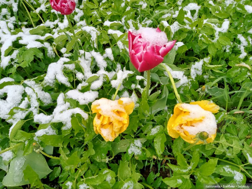 Снег объявился к вечеру. Сейчас лежит на машинах, газонах… Дачи нет, но завтра я (впервые)) собралась сажать цветы у парадной) Бедные тюльпаны у соседей протестуют.