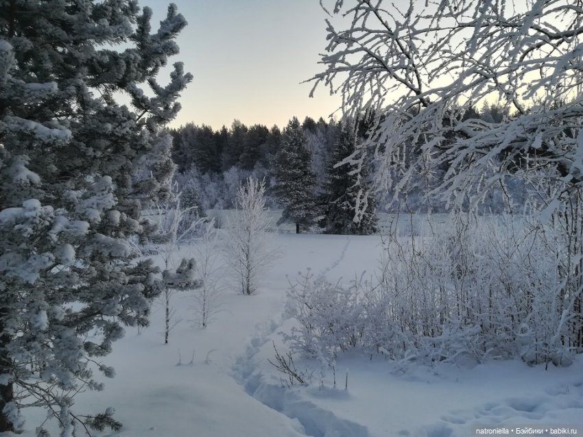 А вот мороз, как оказалось меня меньше пугает. Здесь на фото -38, на ветках изморозь — испарения от практически замерзшей Онеги.