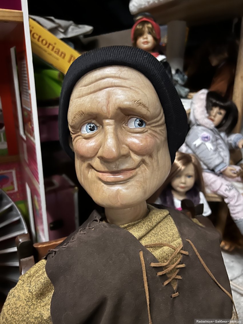 Он действительно здоровяк под метр ростом. Тело шарнирное, пружинный механизм, полностью вырезан из дерева. Всего таких два в мире. У моего номер 2.