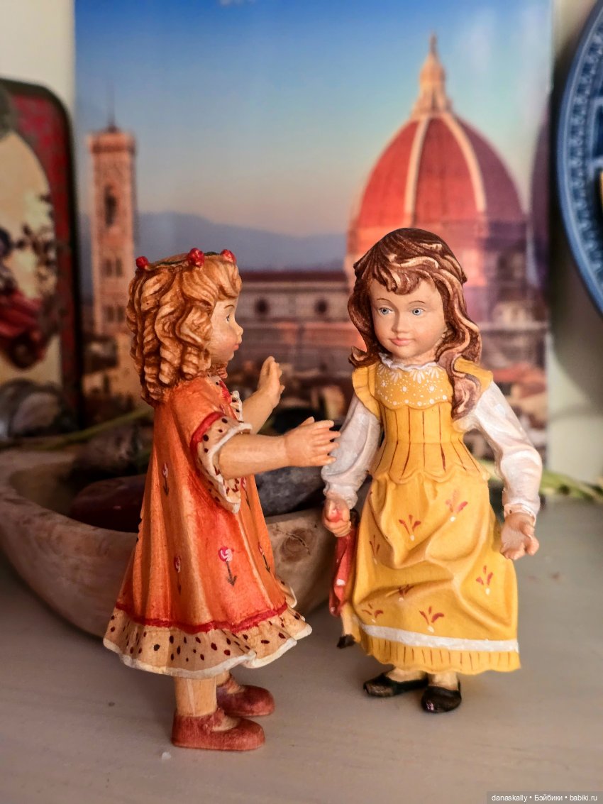 Здравствуйте, друзья! Я очень люблю деревянные куклы и фигурки ручной работы. Недавно у меня на полочке появились две девочки. Они встретились, болтают и не обращают на меня внимания. История этой удивительной фабрики достойна отдельного рассказа. Я же хочу просто показать двух девочек, Елену и Элизабет.