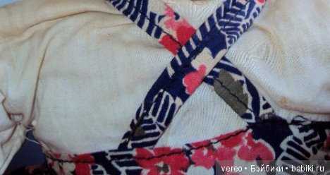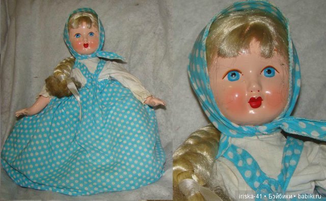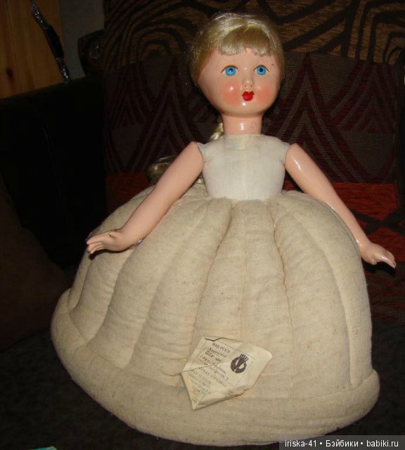 Блузка на кукле такая же, как и у Вашей. Одежда Вашей красавицы конечно оригинальная, только лямочки сарафана поправьте, перекрестье должно быть на спинке. Освежить одежду наверное будет сложно. Я у старых кукол одежду замачиваю в тёплой воде с порошком и кислородным отбеливателем Бос. Он краску не съедает, а цвет освежает, убирая «посерение» ткани. Но как это будет с советским ситчиком, трудно предсказать. Вот блузку отбелит отлично. Вообще, личики этих кукол мне напоминают личики прессопилочных кукол Московской фабрики сувенирных и подарочных игрушек. Но с этикеткой этих чайниц не видела, врать не буду. Вот вроде и все, что могла сказать;)