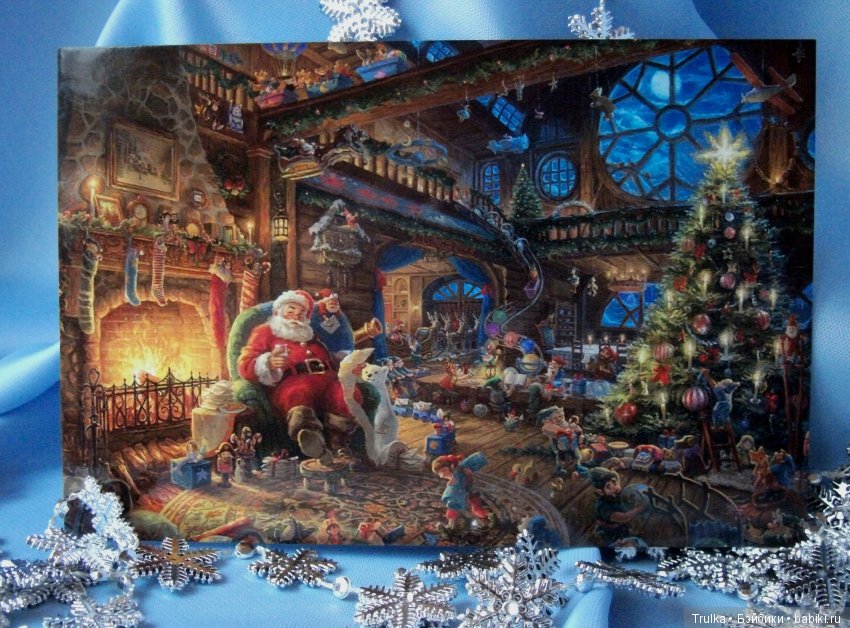 У меня есть открыточки по картинам Кинкейда, если вы не против, я покажу тут одну новогоднюю,«Мастерская Санты».