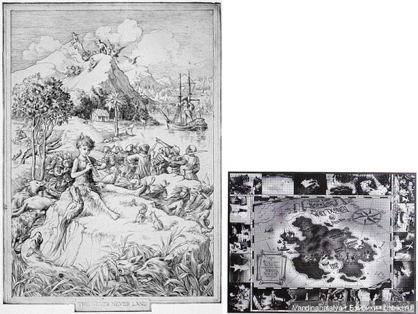«Питер Пэн, играющий на флейте, на фоне Неверлэнда» (иллюстрация Ф. Д. Бедфорда, Питер и Венди), 1911 и Карта Неверленда, созданная Walt Disney Productions в качестве рекламы фильма 1953 года «Питер Пэн».