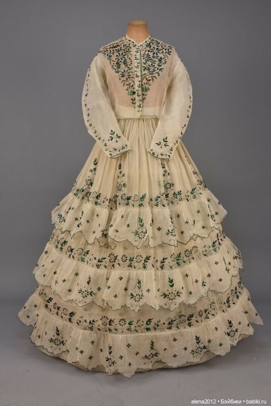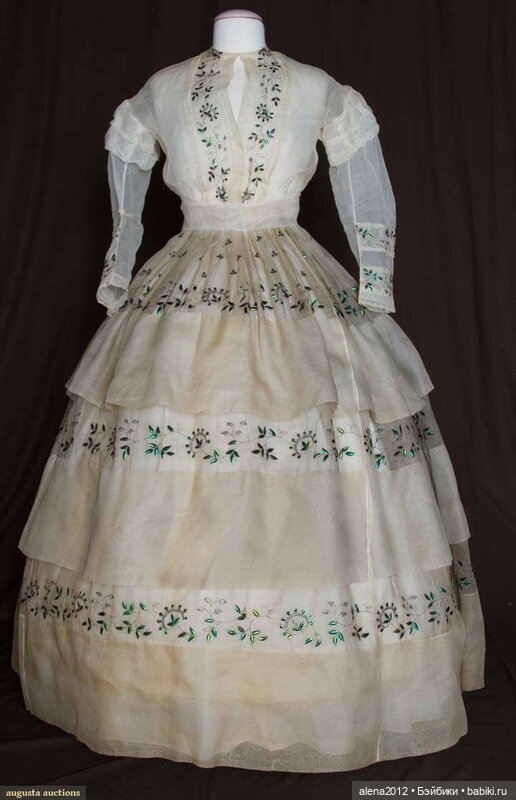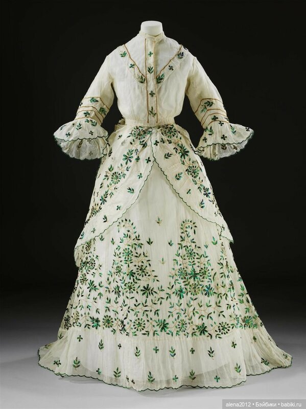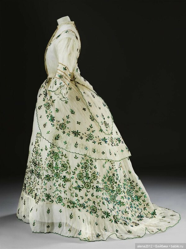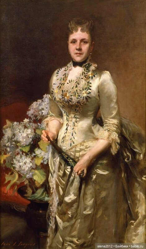 Садиться в подобном платье было нежелательно, поэтому дама могла лишь прогуливаться под зонтиком где-то у себя в саду.