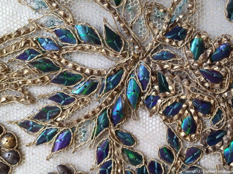На самом деле, для декора используются не крылья, а твердые надкрылья жуков. Их не убивают специально ради этого, златки во многих восточных странах — часть гастрономической традиции: съели жука, вышили надкрыльями шаль. Внешняя поверхность надкрыльев — блестящая, переливающаяся, с эффектом маслянистости, цвет переходит от зеленого к фиолетовому, к синему или к бронзе.
