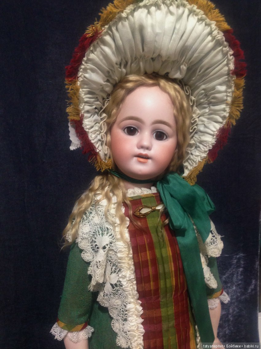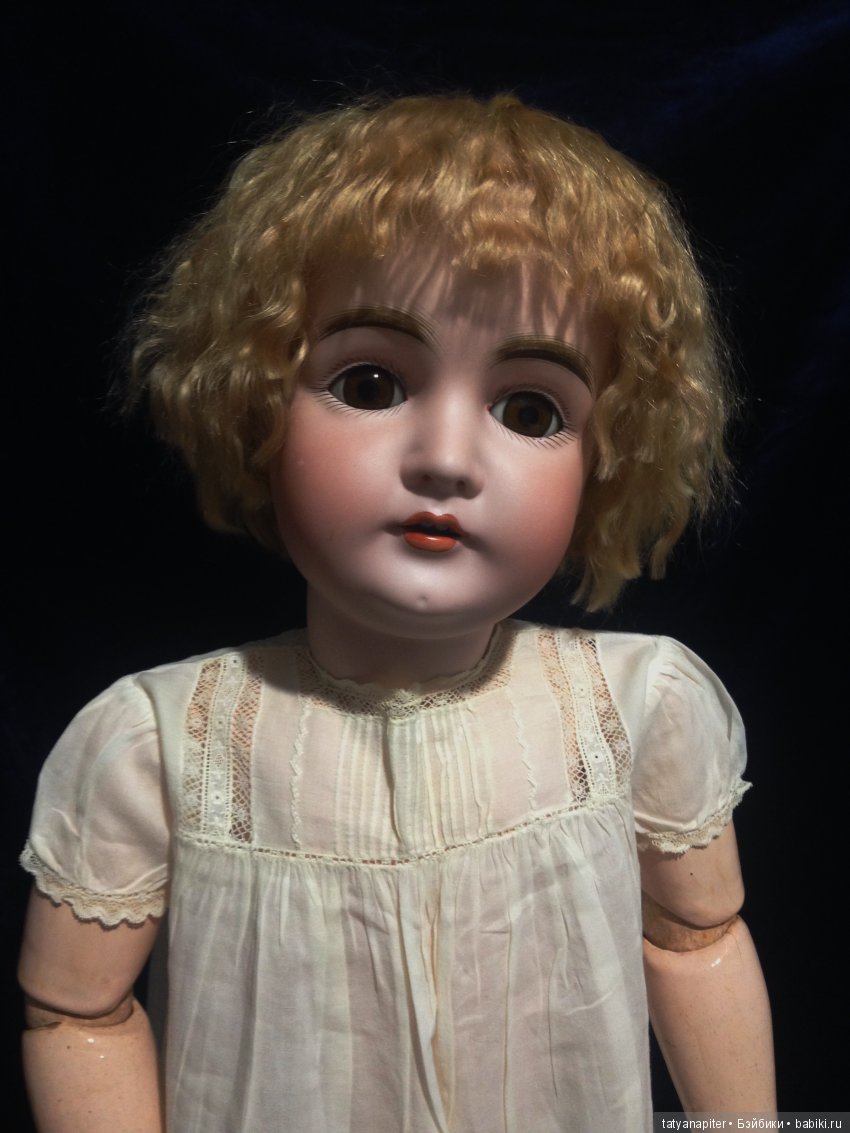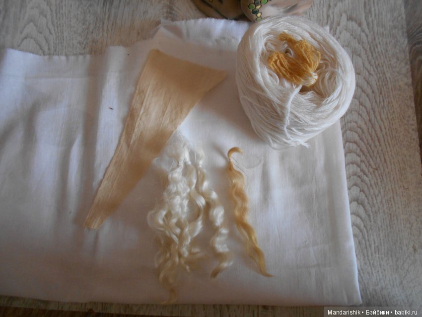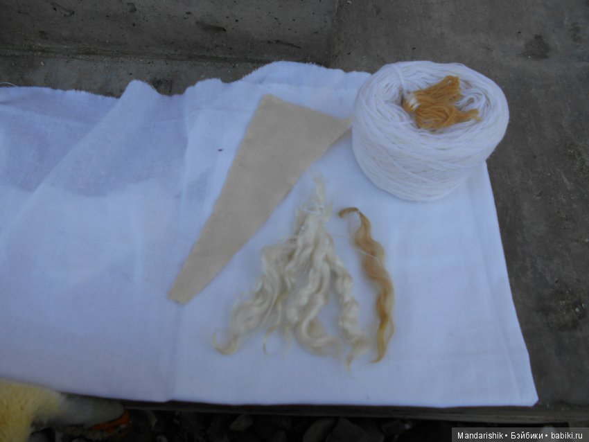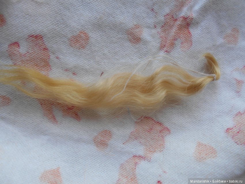 на фоне куклы- у куклы волосики ярко- соломенного цвета, а козочка получилсь светлей самую малость- но бликует- сложно сравнить цвет натурального и искусственного волоса.