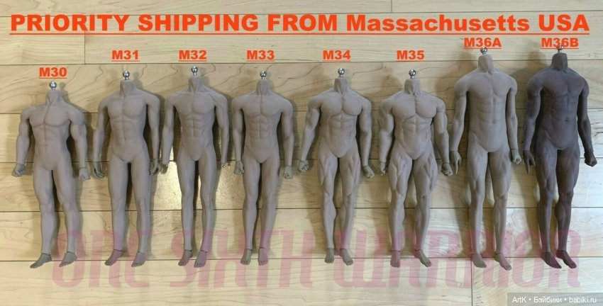 На данный момент все мужские базовые тела выпускаются без головы, со съемными плоскими ступнями (одна пара). Сейчас на торговых площадках можно найти лоты всех моделей со съемными мужскими половыми органами, в разном количестве и разных форм. Стоит обратить внимание, что не у всех продавцов они входят в набор. Их наличие необходимо уточнять заранее.