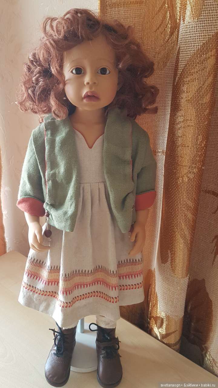 Почему-то эта кукла всегда виделась мне в другом образе. В другой одежде, обуви, с другой причёской. Тем более, что у неё оказались чудесные, подробно вылепленные ушки. Очень захотелось их открыть. Паричок густой, красивого цвета. Труднее всего оказалось с обувью, у девочки нестандартная ножка, а хотелось бы классические фирменные туфельки. Но чего только ни найдешь у нас на Бэйбиках! Здесь всегда помогут. Большое спасибо Татьяне tanysha66, она откликнулась на моё объявление и прислала прекрасные кожаные туфельки. Они подошли Алечке в самый-самый раз. Ну а остальное я постепенно сшила сама: кружевные панталончики (по-моему, очень понравились хозяйке))))), гольфы, трикотажную кофточку и бархатный сарафанчик с аппликацией. Кажется, получилась такая девочка-девочка!