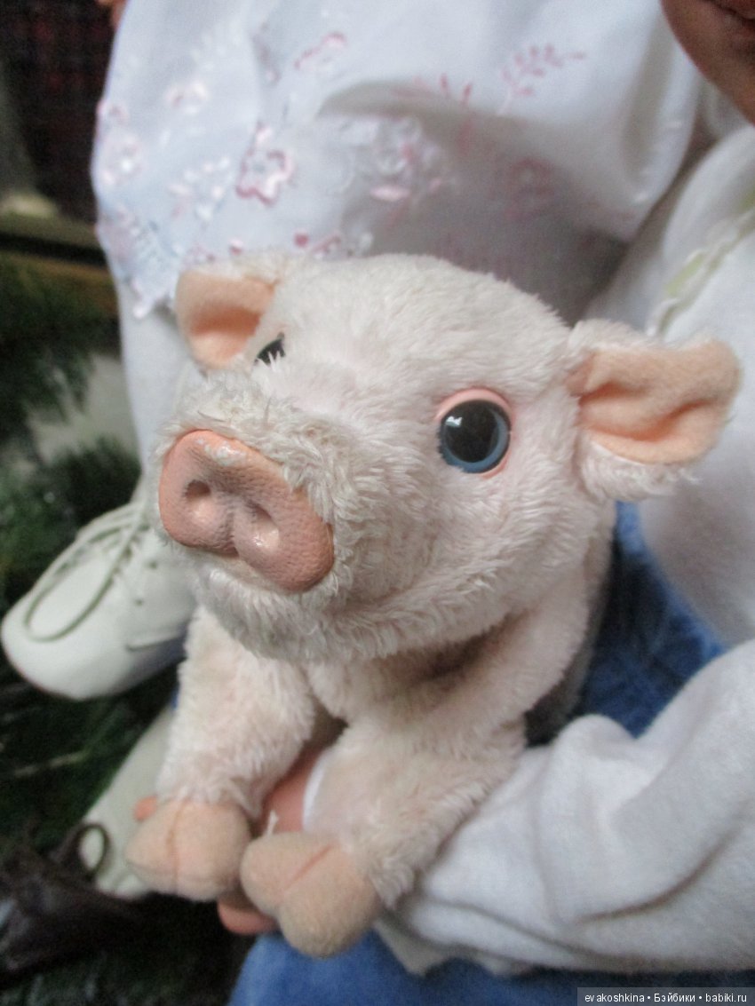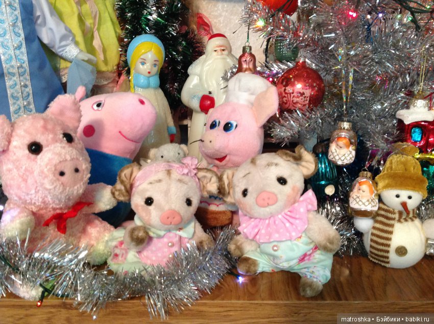Вот такие хрюшки собрались в хоровод под елочку — простые, мягкие, давно подаренные, из детских игрушек, один поющий — «Хрю, хрю, я поросёнок..»
