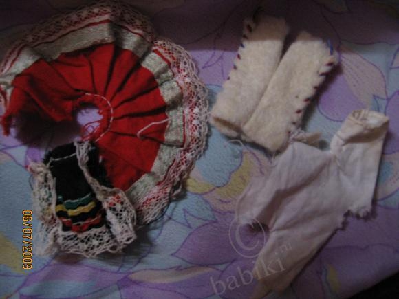 В костюмах были только 2 большие куклы, а пупс с таким же клеймом появился у меня гораздо позже и без ничего, поэтому в чем был он, не знаю.