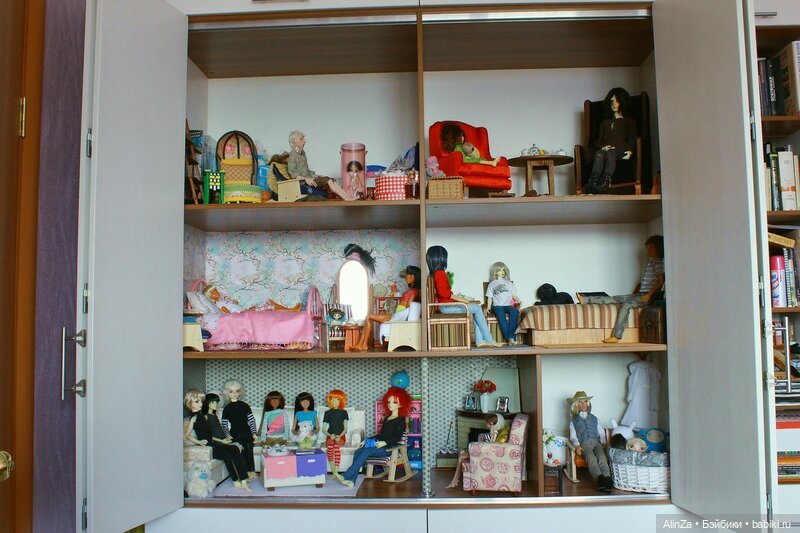 А хранение я уже даже описывала Лене Skyler — стеклянный секретер и 3 полки посудного шкафа заполнены армией 1/6, а для остальных специально заказанный шкаф, почти 2 метра в длину, со складными дверцами. Планировалось что там будет интерьерный особняк для mooqla- и bjd-старожилов, но вышла тесная общага для всех подряд)))