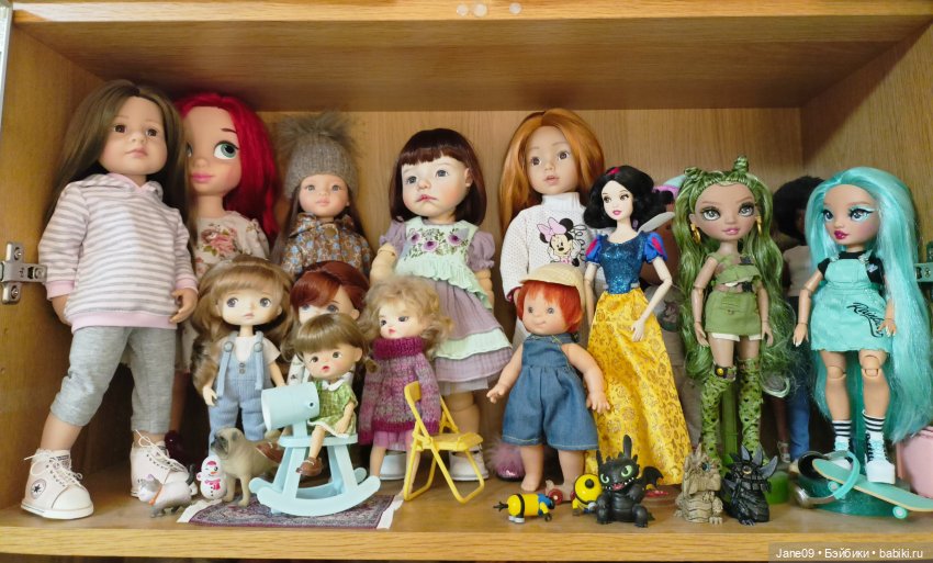 У меня тоже живут разные куклы, признаться, в шкафу уже тесновато, поэтому две другие полки «на оформлении») Да и маленьких нужно посвободнее разместить.
