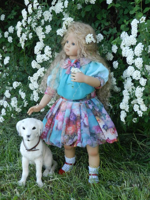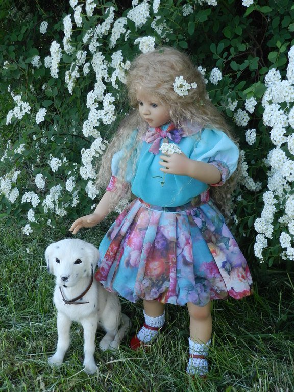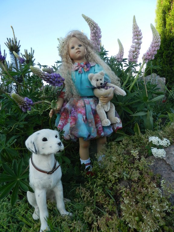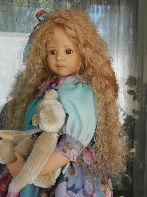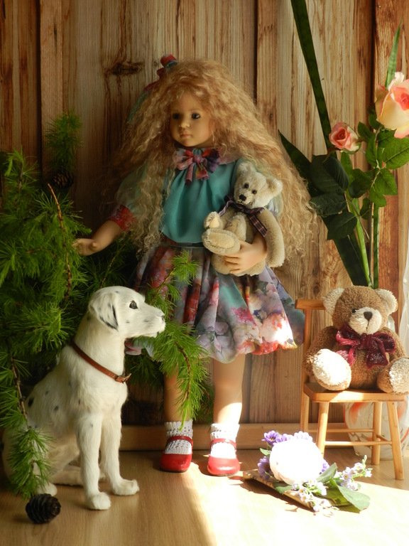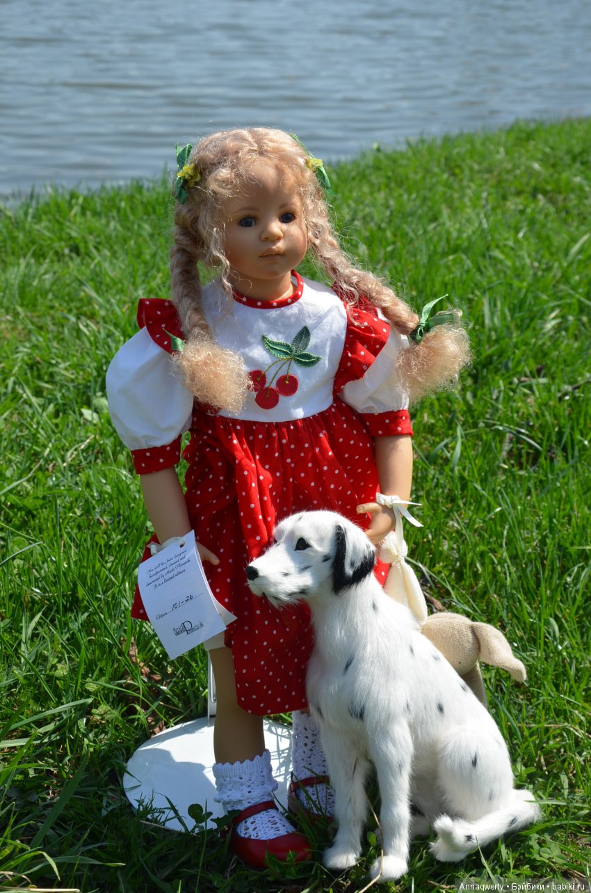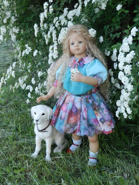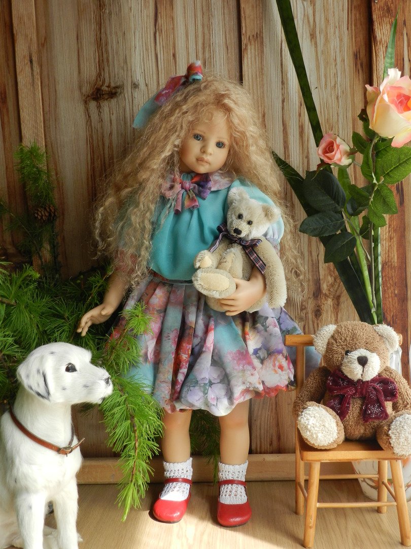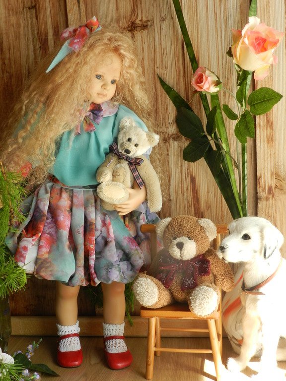 Милашка создана фрау Хайди в 2002 году, наша девочка уже раритет, лимит 101 такая девчушка по всему миру, наша Анне родилась 43:), ростиком 60 см, материал-винил, а тельце тканевое, каркасное, ручки и ножки из винила на 2/3, девочка может сидеть и принимать различные позы.Волосы-паричок, натуральные, шикарные, длинные, кудрявые… одним словом- красавица! А ещё у неё есть друг, верный пёс, тоже красавец:)