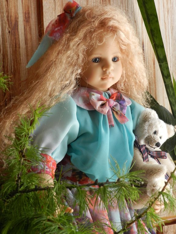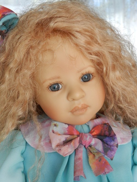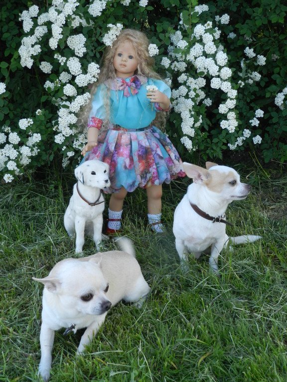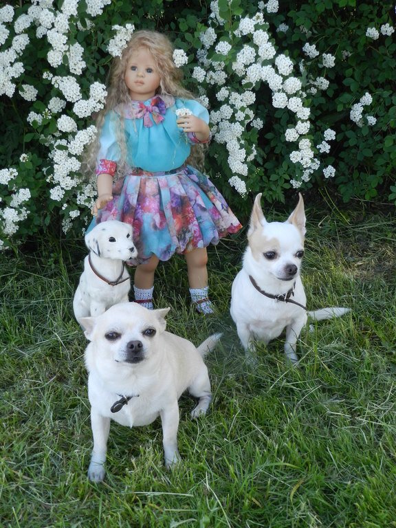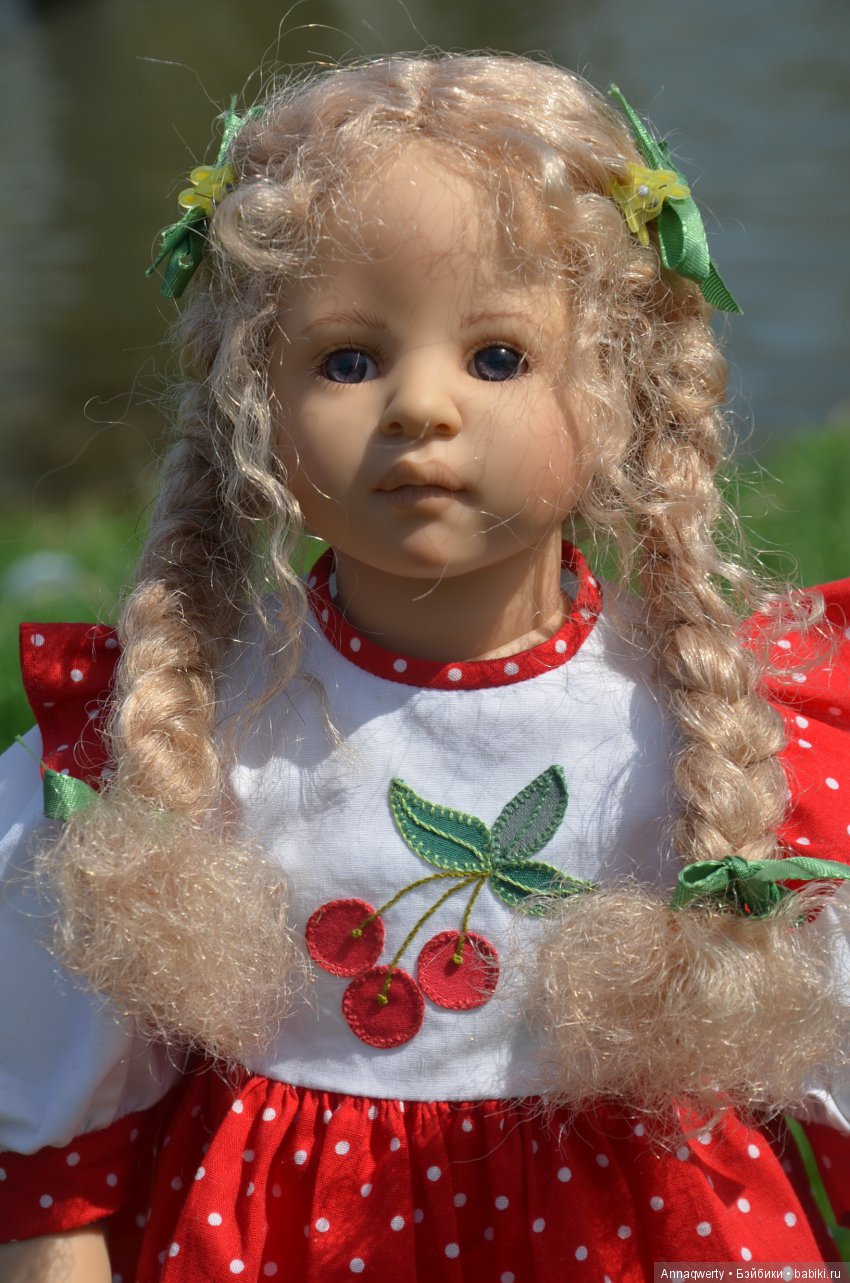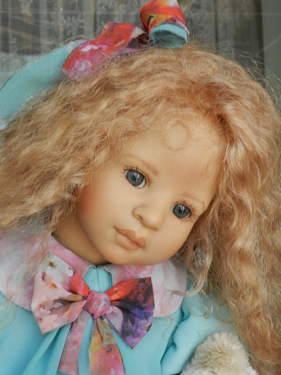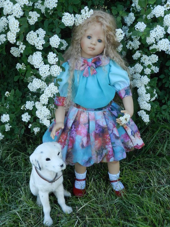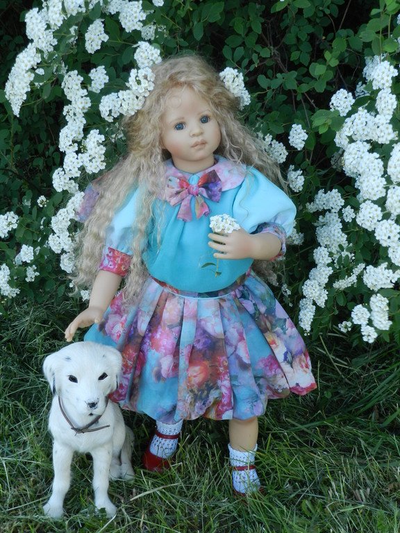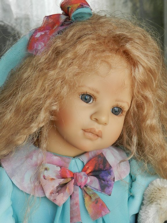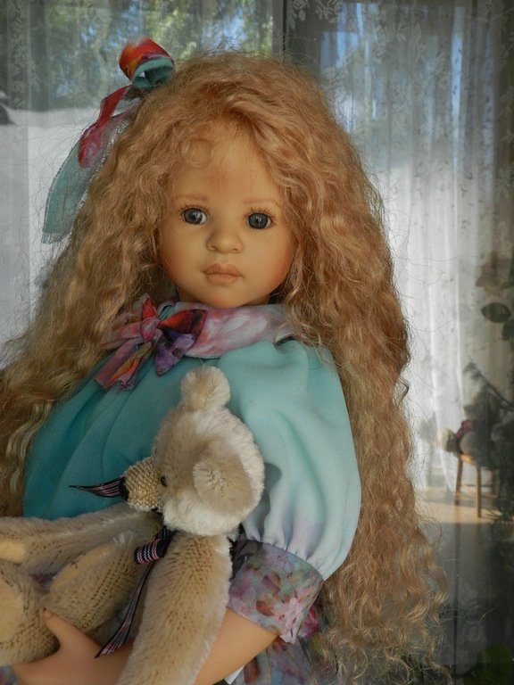 Милашка создана фрау Хайди в 2002 году, наша девочка уже раритет, лимит 101 такая девчушка по всему миру, наша Анне родилась 43:), ростиком 60 см, материал-винил, а тельце тканевое, каркасное, ручки и ножки из винила на 2/3, девочка может сидеть и принимать различные позы.Волосы-паричок, натуральные, шикарные, длинные, кудрявые… одним словом- красавица! А ещё у неё есть друг, верный пёс, тоже красавец:)