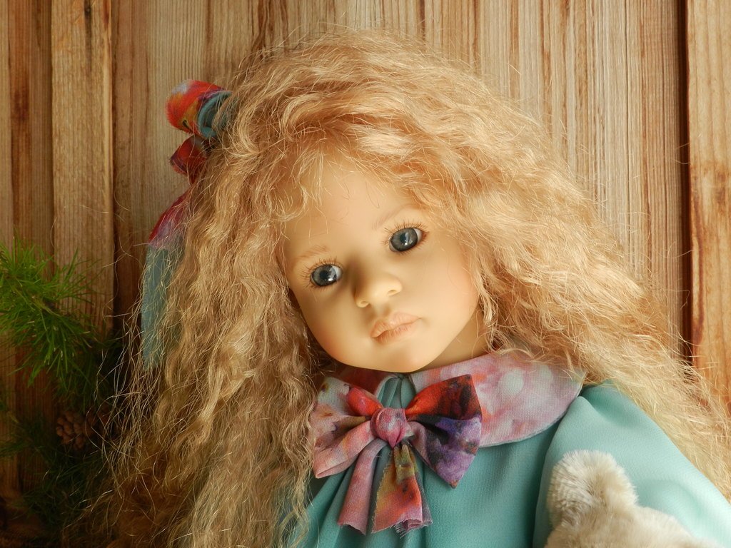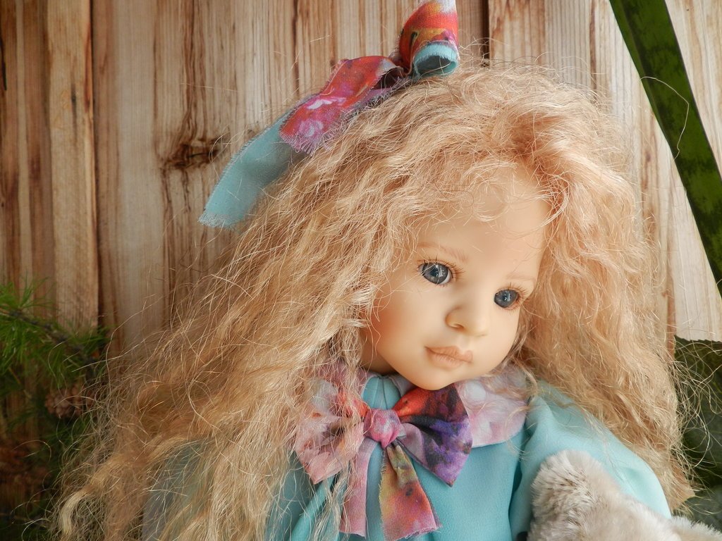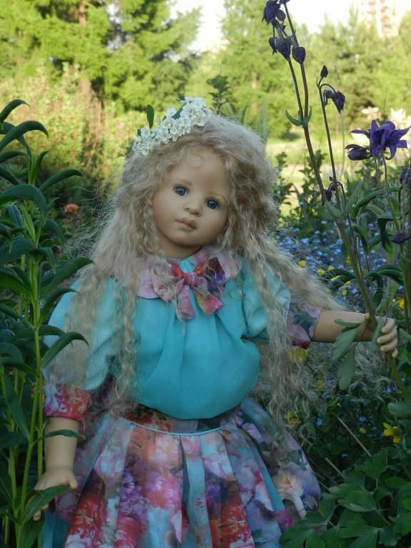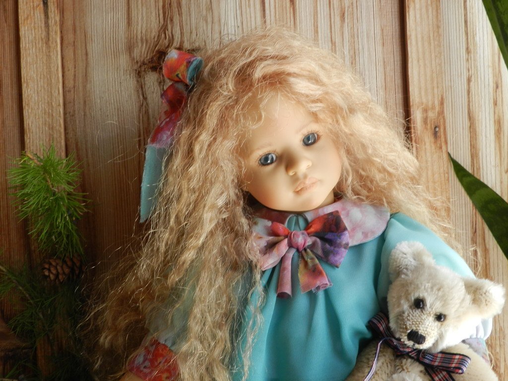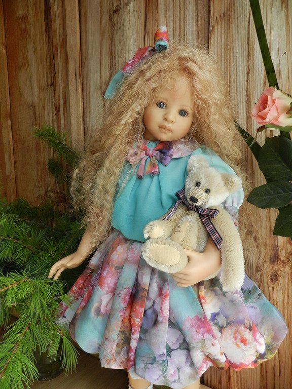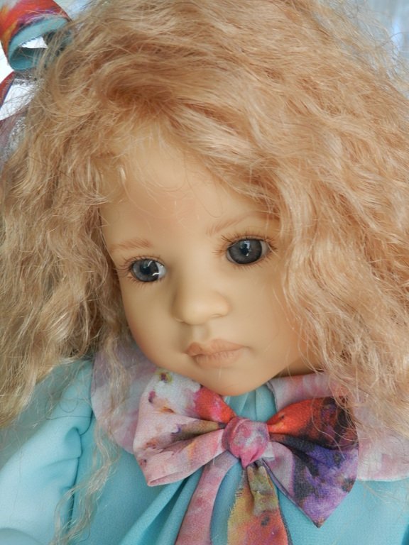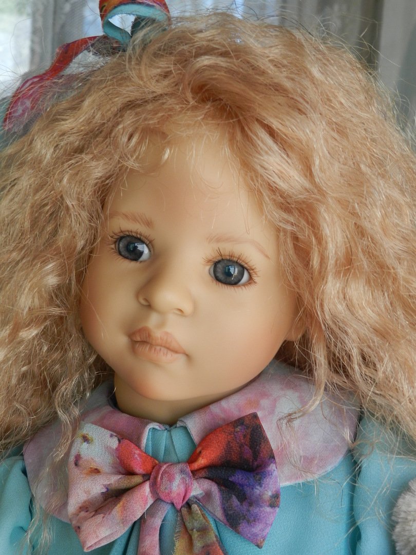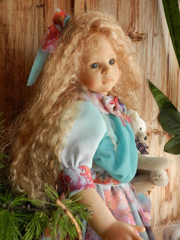 Милашка создана фрау Хайди в 2002 году, наша девочка уже раритет, лимит 101 такая девчушка по всему миру, наша Анне родилась 43:), ростиком 60 см, материал-винил, а тельце тканевое, каркасное, ручки и ножки из винила на 2/3, девочка может сидеть и принимать различные позы.Волосы-паричок, натуральные, шикарные, длинные, кудрявые… одним словом- красавица! А ещё у неё есть друг, верный пёс, тоже красавец:)