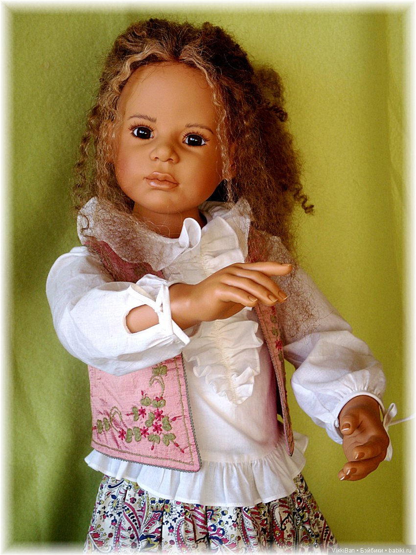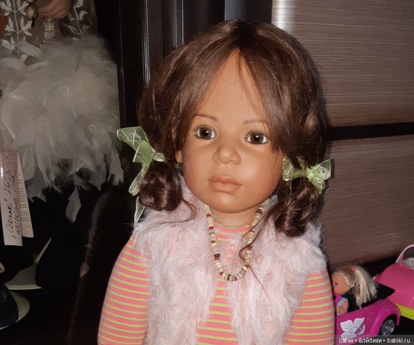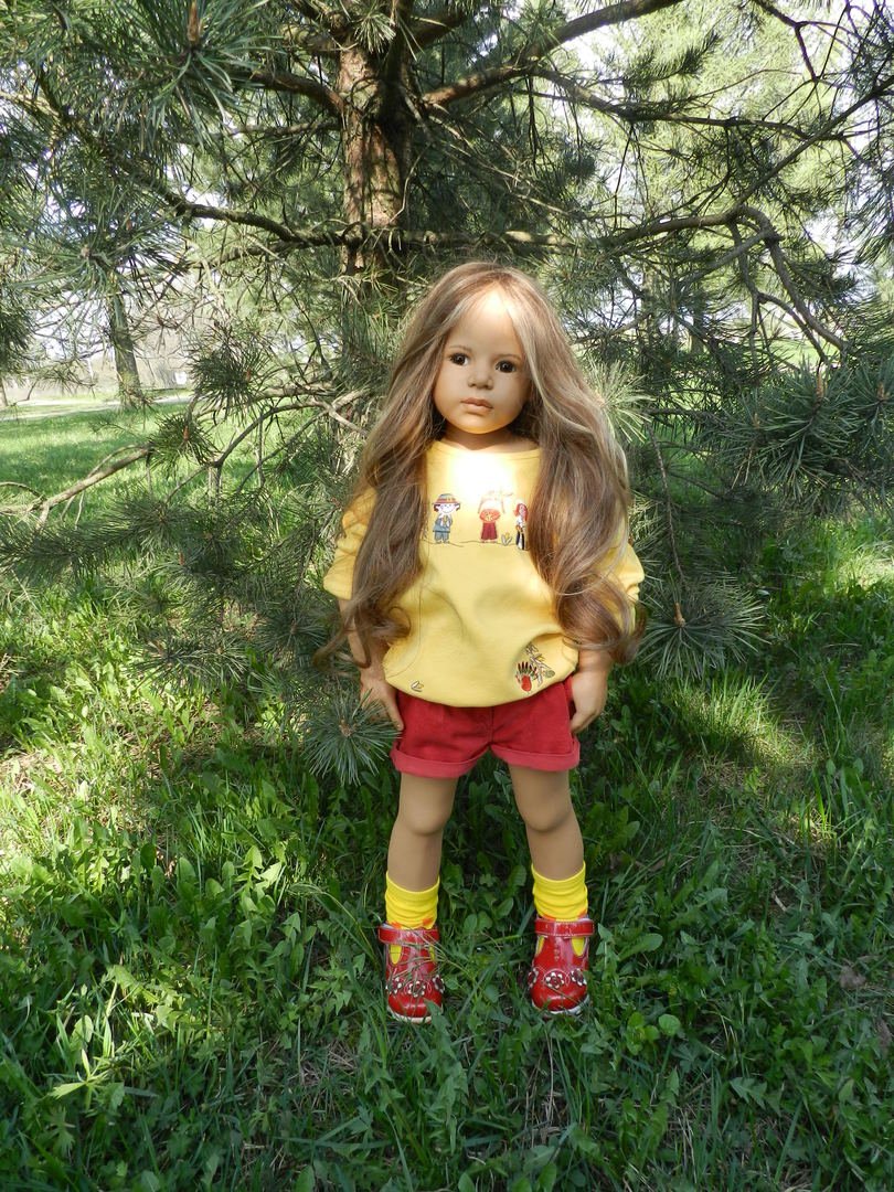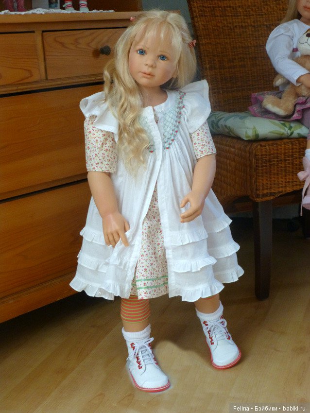 Лимит нашей красотиночки 120 по всему миру, она 2010 года выпуска, ростиком около 82см, шарнирная, кроме ножек, полностью винил, может сидеть и стоять, с чудесными глазками, волосы густые, натуральные и просто шикарные! Правда родную причёску мы потеряли:(Волосы у Сесиль были собраны в хвост и поспутались со временем, я ж решила их распустить и естественно помыть, но совсем не ожидала, что кудри её исчезнут:(, думала, как и у малышек, кудряшки останутся прежними… Но мы с лапочкой совершенно не расстроились, нам пока и так замечательно:)