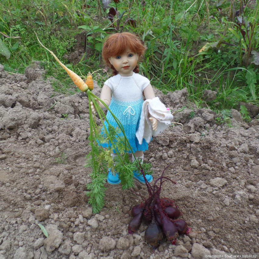 А на огородах тем временем продолжается «битва за урожай». Вот и мы, отложив парк на потом, поехали в деревню собрать остатки урожая и перекапывать грядки. Хозяйственная Линнет увязалась за нами.