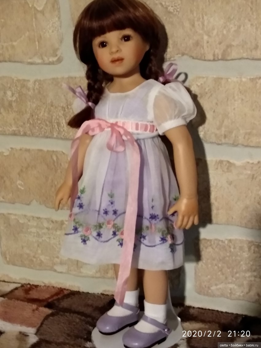 Её имя — Fenja. Как звучит и что означает — не знаю. Молдик Роми, год 2011. Для меня самый красивый и редкий. Одета превосходно, батистовая блузочка, кружева, бант, сарафанчик из хлопка с вышитыми цветами! Ленты в волосах! Состояние отличное.