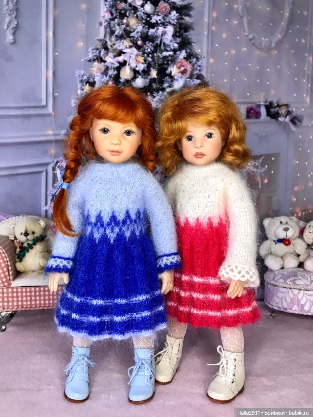 В этом зимнем сезоне я увлеклась вязанием из кид- мохера для моих любимых моделей Плюшечек, рост 26-27 см. Не смогла удержаться, хотя несколько лет я избегала из него вязать, уж очень он тонкий. Но эти сочные, яркие цвета меня просто покорили! Все платья я связала спицами 1,5 мм, нитки Kid Royal Mohair Alize.