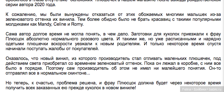 Старые выпуски, интересная тема для меня. Были большие лимиты, допустим 120шт ( да, раньше автору помогали помощницы, поэтому физически могла сделать больше) Думаю сейчас делает сама, поэтому лимиты маленькие. Ну это я так думаю. Но замечаю что мало есть в продаже, просматриваю иногда ибей и таки редко продают старые выпуски. Вопрос, в загранице детям покупают эти куклы( после детей вероятнее кукла выходит из строя)? Или все осели в коллекциях?