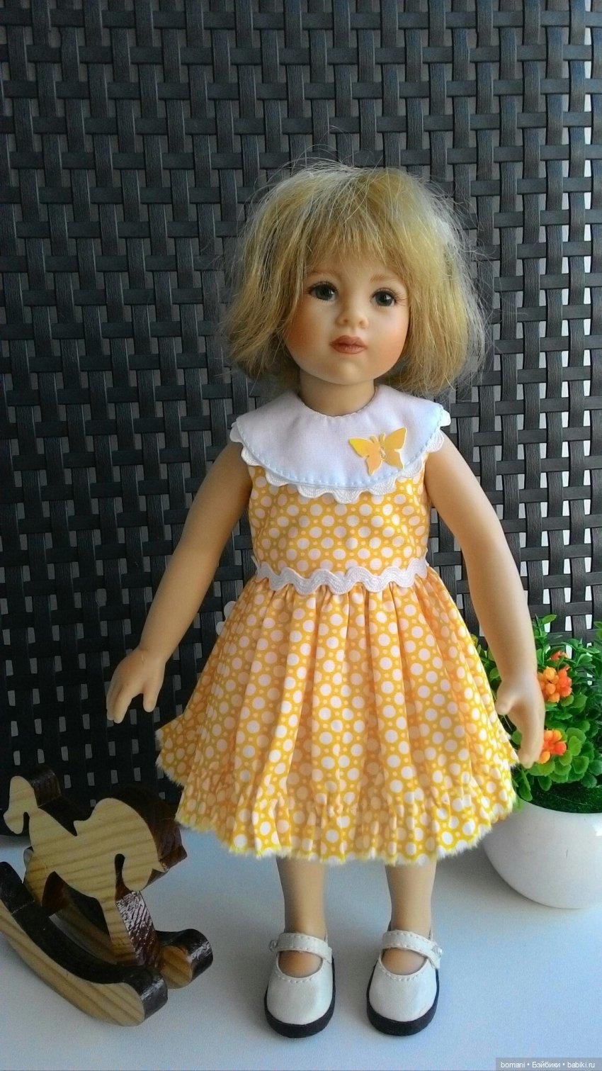 Хотела сшить что-то для новенькой, а потом устроить знакомство с вами, но понимаю, что сначала надо закончить наряды для других куколок. Поэтому знакомимся в платье, сшитом фирмой «Boneka». Платье с пятнышком. Отстирывать еще не пробовала.