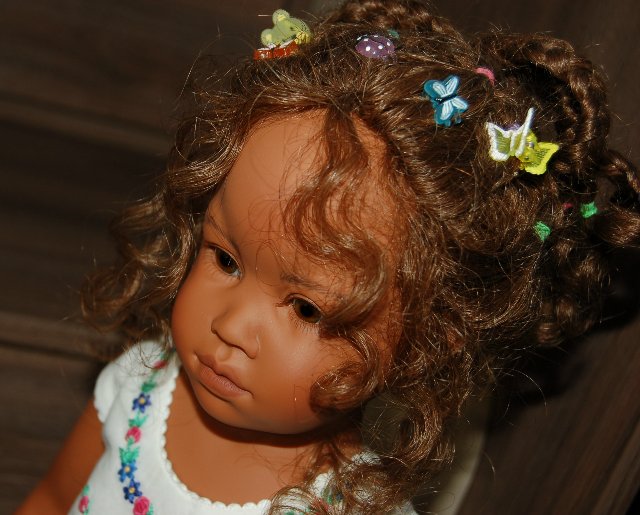 Здравствуйте, дорогие гости моего топика)! В последнее время стала неровно дышать к «шоколадным» девочкам)) Они какие-то особенно трогательные и необычные) Представляю Вашему вниманию мою любимицу — девочку Machui от Heidi Plusczok (коллекция 2008 года). Machui появилась у меня совсем недавно и совершенно не вписывалась в мою коллекцию куколок Gotz (Готц), но, в итоге, полюбилась мне больше всех) Это моя первая куколка от этого автора, и когда я взяла её в руки, то поняла, что эта не последняя моя плюшечка))) Девочка просто идеальная (спасибо предыдущей хозяйке — RebeccaS — за такую лапочку!)! Потрясающие волосы — густые, кудрявые) Личико удивительное! И её, действительно, как я читала раньше в других топиках, очень сложно сфотографировать) Но я попыталась, и теперь с удовольствием показываю Вам свою красавицу)