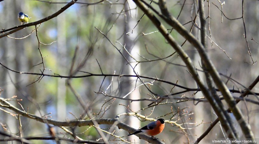 Редкий кадр со снегирём. Что-то совсем мало встречаются. На верхней веточке — лазоревка.