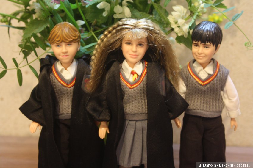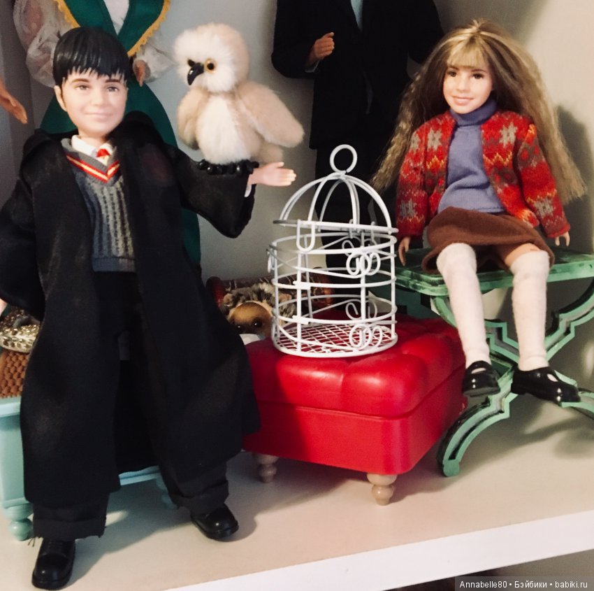 У меня уже есть старенькие Гарри, Рон и Гермиона (малыши от Маттель) — они кучкой, им не скучно; ООАК Снейпа и современная Гермиона — они пара; современные Дамблдор — он один, за всеми присматривает; и подросток Гарри. Есть и те персонажи, которых я придумала сама, вписав в канон — брат и сестра Нотт.
