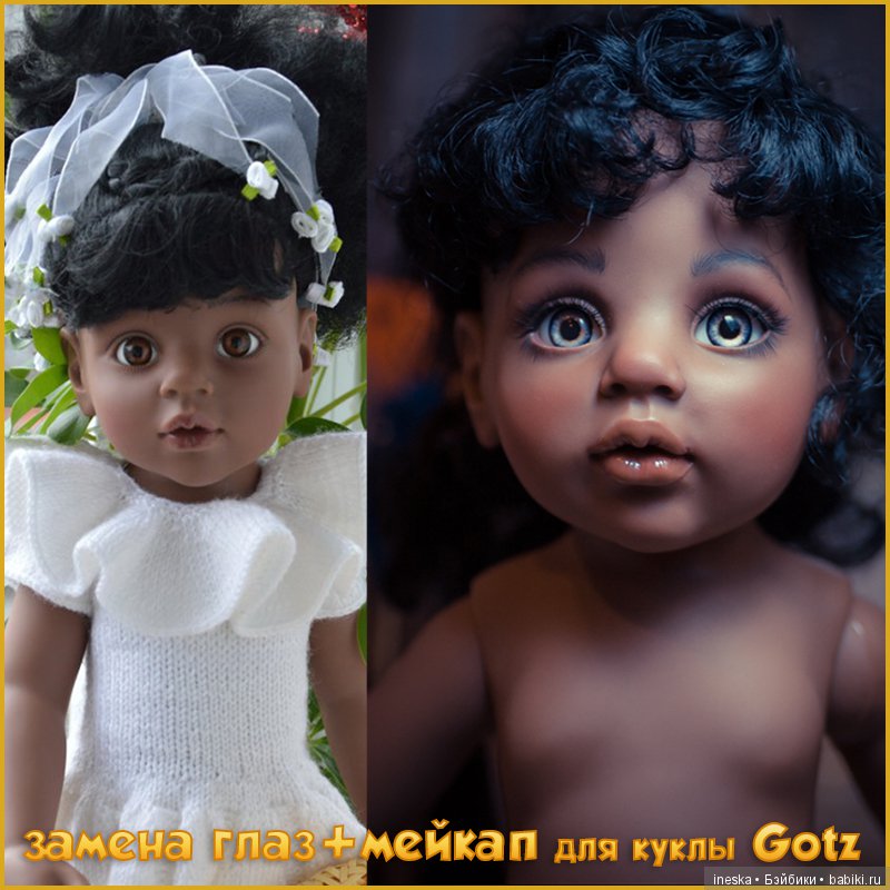 Был в прошлом году у меня заказ на мейк и замену глаз для «негритенка» Нины :) Тановую куколку я расписывала впервые и столкнулась с тем, что мейк на ней выглядит совсем иначе и где-то даже непредсказуемо… В итоге получилась девочка, потерявшая свой детский шарм. И именно за это была небезосновательная критика.