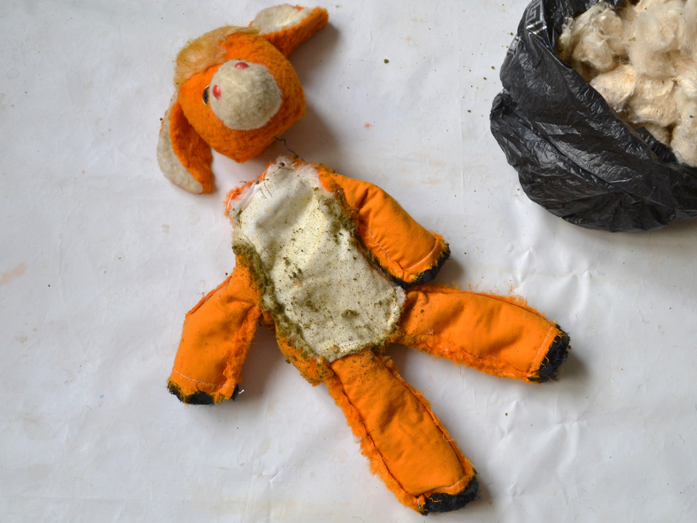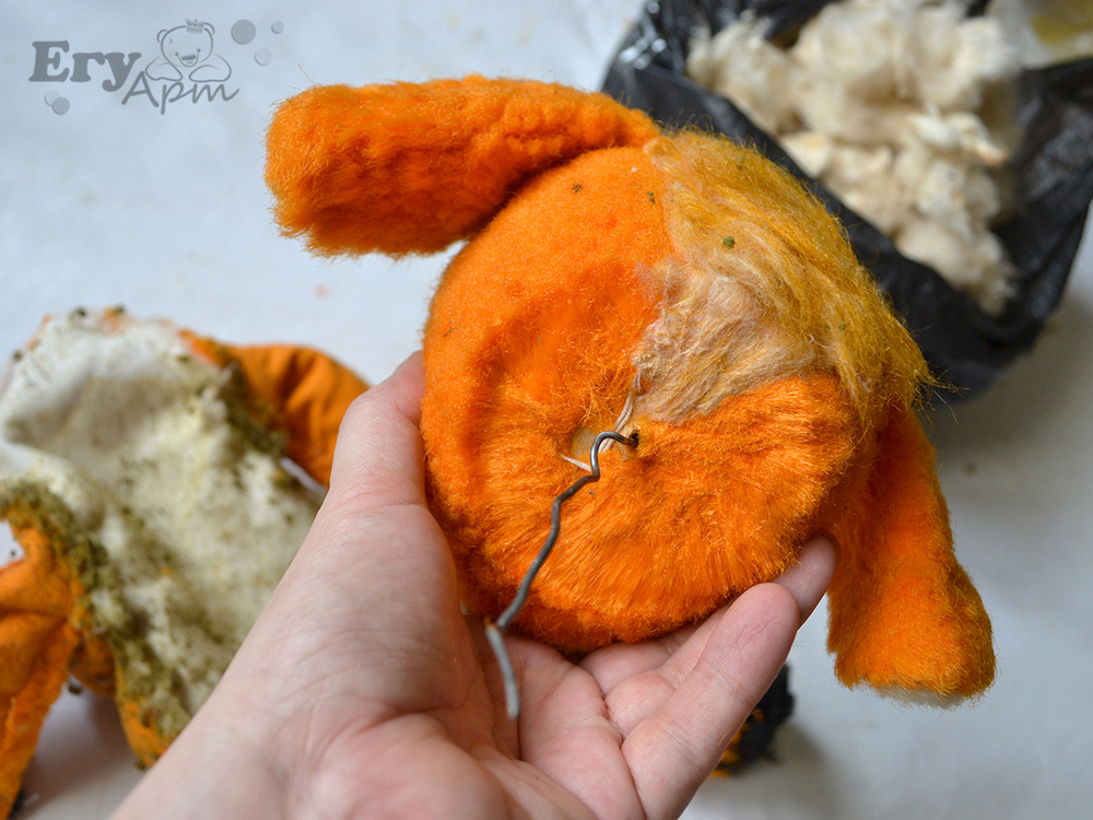 Распорола по заднему шву шкурку. Убрала старую истлевшую набивку