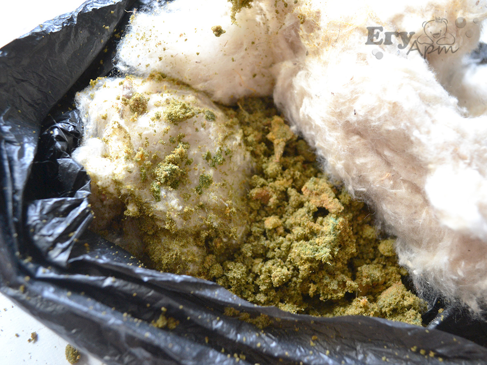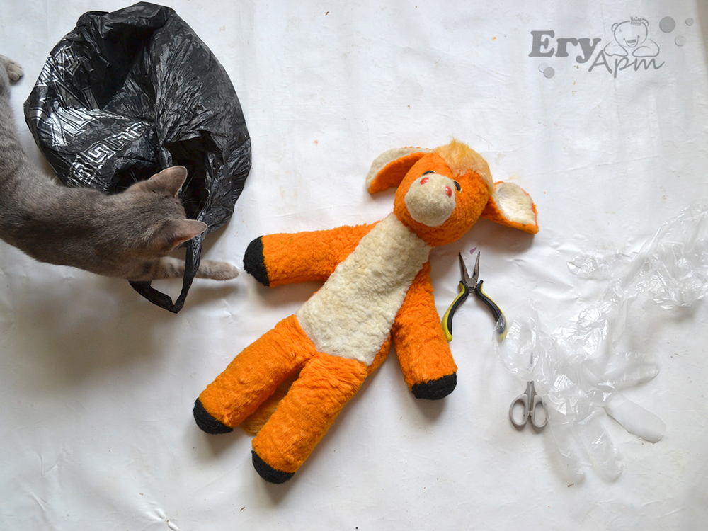 Итак ослик готов к преображению, я подготовила немного инструментов для начала работы. Самые обычные: ножницы, пакет и перчатки. С группой поддержки работа начинается ладно)