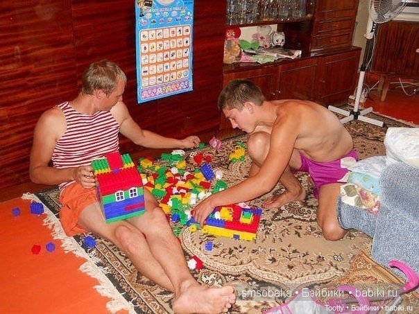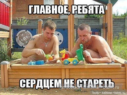 Мы когда в наш новый дом переехали, у нас работал сотрудник мужа, он на все руки мастер, помогал мужу стелить ламинат, вставлять двери, клеить плитку — дом куплен в черновой отделке. И вот они вышли на улицу подышать) один на качельку сел, второй на деревянный мотоцикл качалку — которую то же муж делала во дворе для детей) а я им ещё по мороженке купила) сидят с мороженками на качалках дядьки по 40 лет) я их сфоткала но на старый, кнопочный телефон. Жаль не сохранилась эта фотка) а так забавно)))