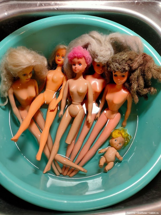 С куклами то же самое, вчера вот взялась мыть очень грязных бедолаг, получила коробку, в которой несколько барбиобразных, какие- то аксессуары, например, жуткие розовые качели и одежки. Меня хватило только на то, чтобы помыть всех и расчесать тех, кто сразу расчесался. Три головы остались лежать, намазанные маской для волос, а до остального я не добралась. И, зная себя, могу сказать, что эта коробка будет стоять в коридоре долго.)))