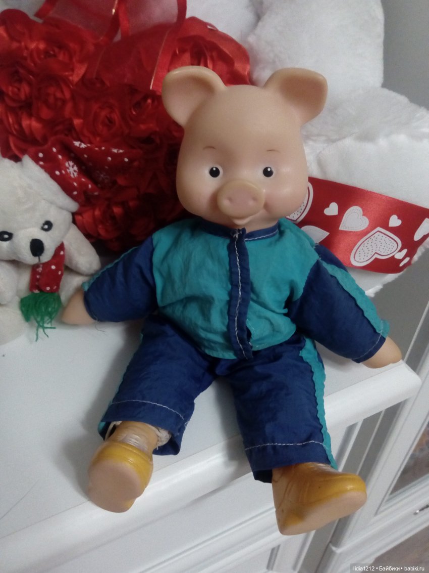 Нашему тоже лет 15, свекровь дочке привезла. Игрушек у нас было море, но Хука( Хрюшу так дочка звала, не выговаривала еще) так этот Хука и ел, и гулял, и спал, и мыться с ней ходил)) комбезик родной расползся сразу, этот костюм я сшила из капюшона от спортивного костюма))