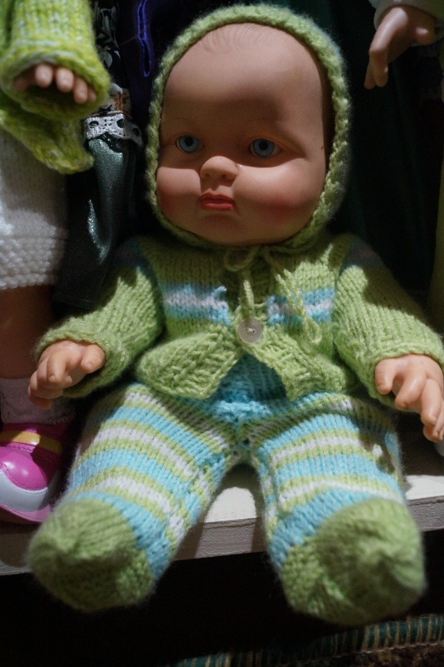 Малышку я решила нарядить в вязаный комбинезон, как знаете малюток китайчат продавали в корзинках в 90-е) с резиновыми игрушечками. Эта куколка по крупней.