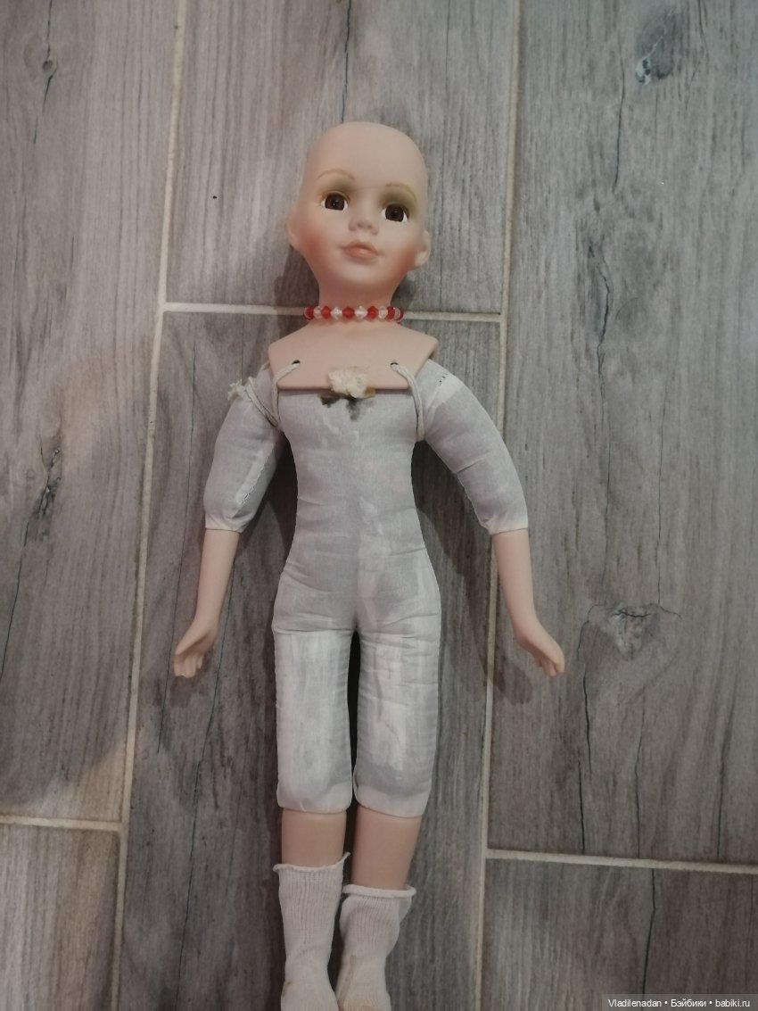 Здравствуйте. Делюсь своим первым опытом замены мягконабивного тела фарфоровой куклы. Это промежуточный этап, нужно ещё вклеить ресницы, подобрать парик и сшить одежду и обувь, но мне уже очень нравится, что получилось. Конечно, больше я не буду такое повторять для кукол этого класса исполнения – овчинка не стоит выделки – всё было исключительно для тренировки.
