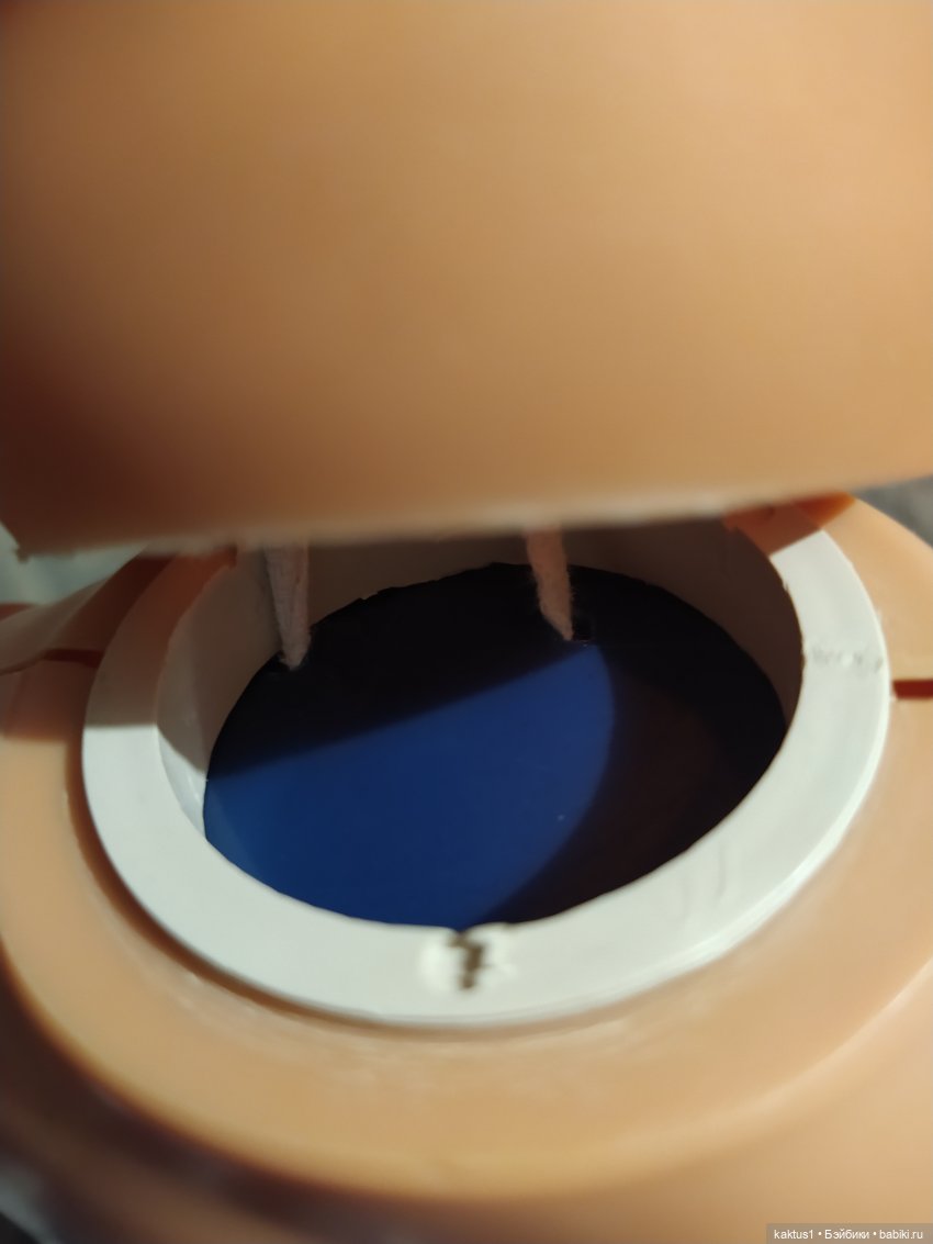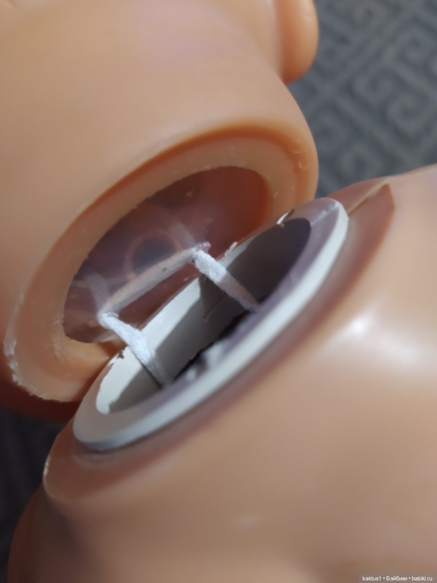 . Да уж, совсем не то… Но на помощь всегда приходят друзья! Спасибо огромное Ларочка vodosbor! Два кружочка, вырезанные из капроновых крышек, горячий гвоздь и верёвочка решили проблему. Сначала поставила резинку, но не понравилось — голова тяжёлая, свешивалась набок. Вот такие мы теперь :)