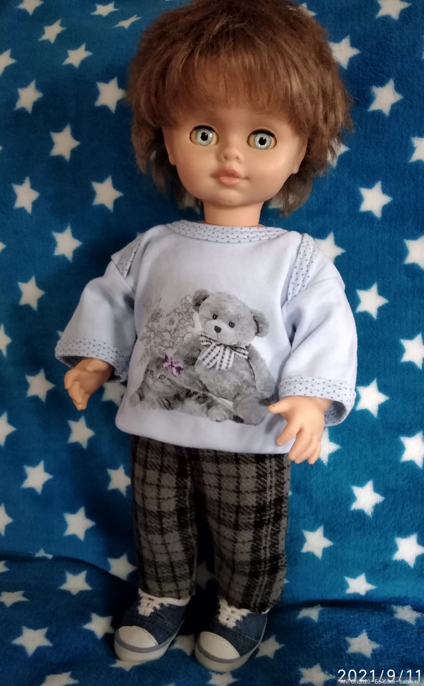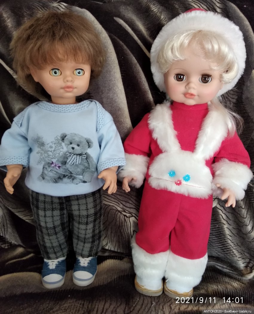 Вот я его сфоткала с Весняночкой, которую мне подарили несколько лет назад, рост примерно одинаковый, но личико как-то поменьше у него, по-моему...)
