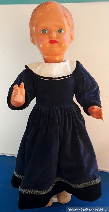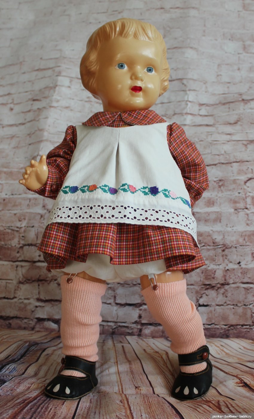 Конкретно эту куколку я видела вживую в Музее уникальных кукол в Москве. Решила — не, не нужна, слишком большая. И вот внезапно на Мешке я вижу эту же целлулоидную красавицу охтинского комбината и решаю немножко поторговаться. И… проигрываю! Ну тут уж дело принципа! Начинаю искать такие же варианты. Опуская подробности, досталась она мне практически в состоянии лома.