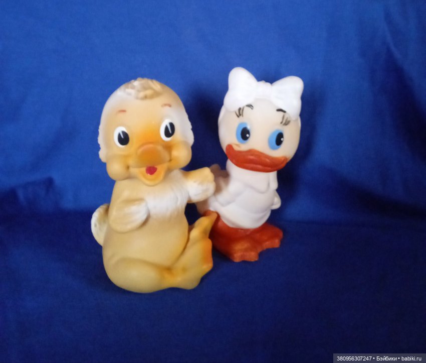 У утят нет клейм, кто выпускал таких не знаю, Поночка выпускалась вместе с другими персонажами мультфильма Утиные истории и были аналогичные наборы персонажей из мультфильма Спасатели спешат на помощь, а вот утёнок тоже из советских мультфильмов, были такие разные мультфильмы про утят, например где они в футбол играли