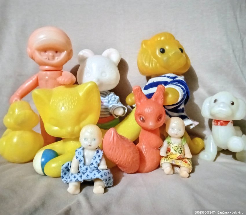 Космонавт, мишка подвижные ручки, ножки, головушка, а у льва кроме подвижных ножек, ручек и головушки, подвижен ещё и хвостик, а щеночек спаниель подвижны все ножки и головушка, может служить, давать лапу, сидеть, лежать, стоять, подымать лапку на деревце, белочка подвижны хвостик и головушка, котик с клубком подвижна головушка и клубок, любимое занятие советских детей гонять такие плоские игрушки по ковру в детском садике, пупсики крошки приблизительно 9,5 сантиметров, подвижны только ручки и ножки. Вот фото с этикеткой из интернета, на авторство не претендую.