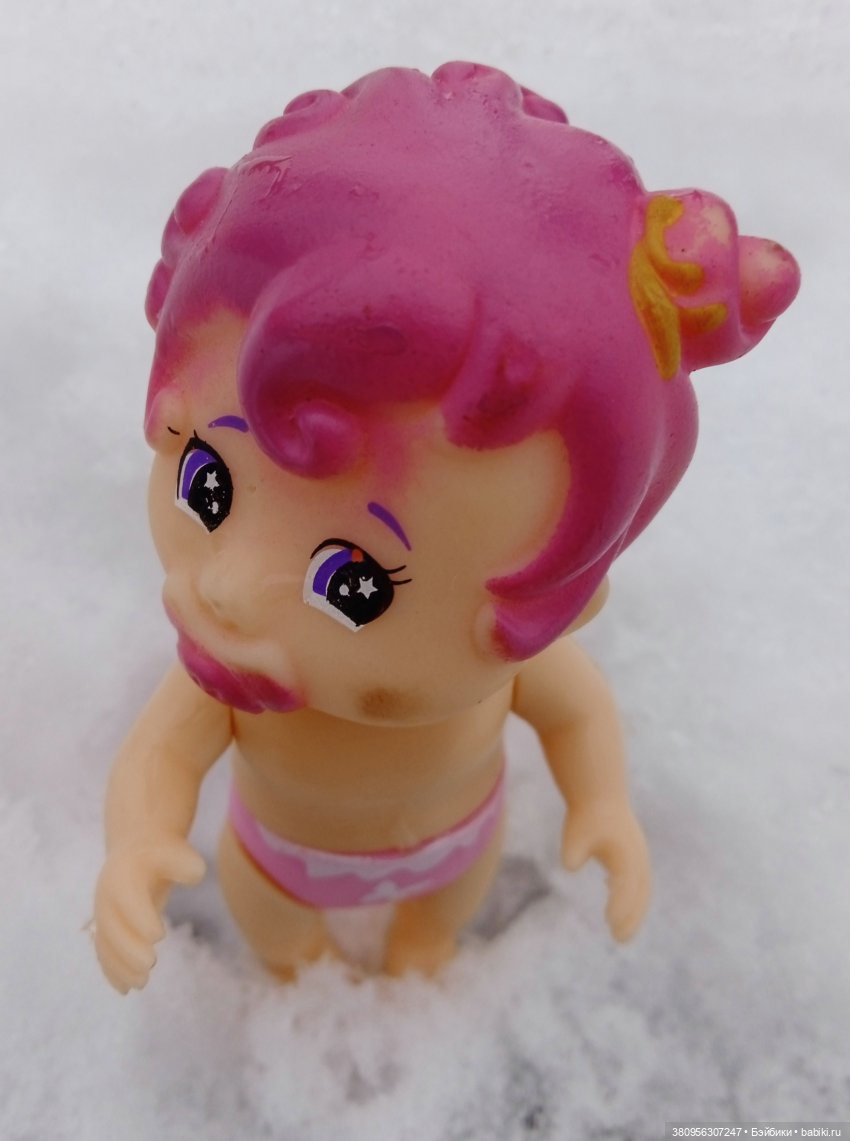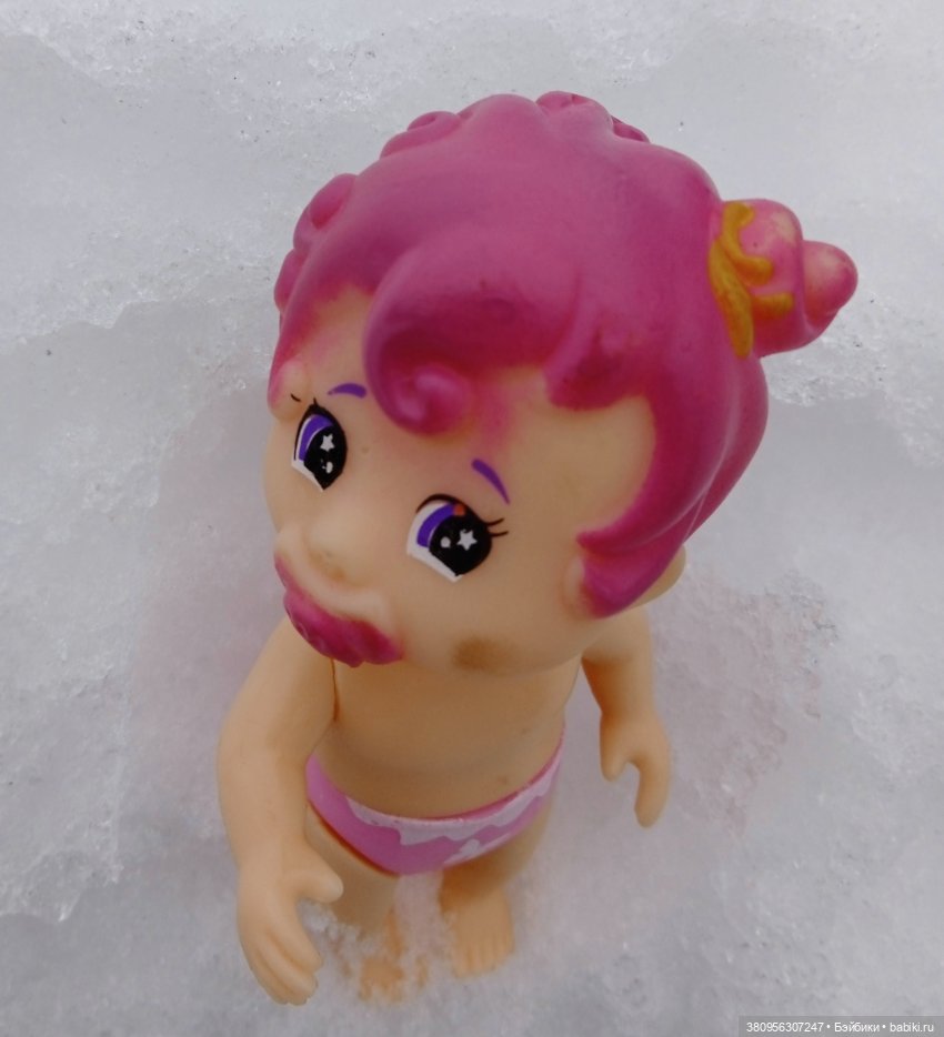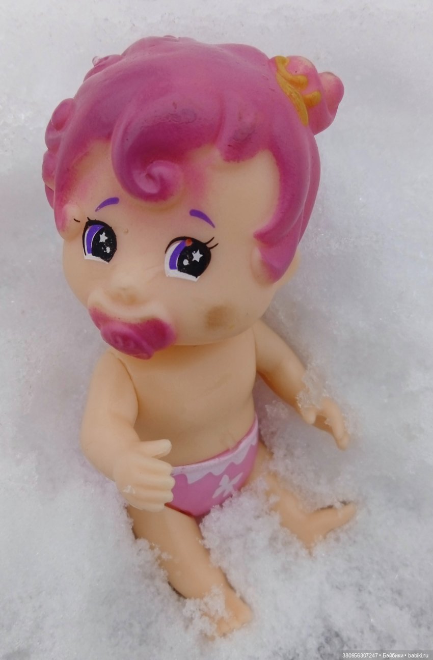 А сегодня у вас вот такая маленькая гостья, мороза не боится, на снежке веселиться, вот такая шаловливая, шкодная малышка, везде лезет, всё рассматривает, вот и носик с щёчкой феном припалила, всё равно хорошенькая, она одна в магазине осталась из-за помятого личика, меня ждала, в блистере кроме куколки была карточка, на ней написано название куколок, — Bizzy Bubs.