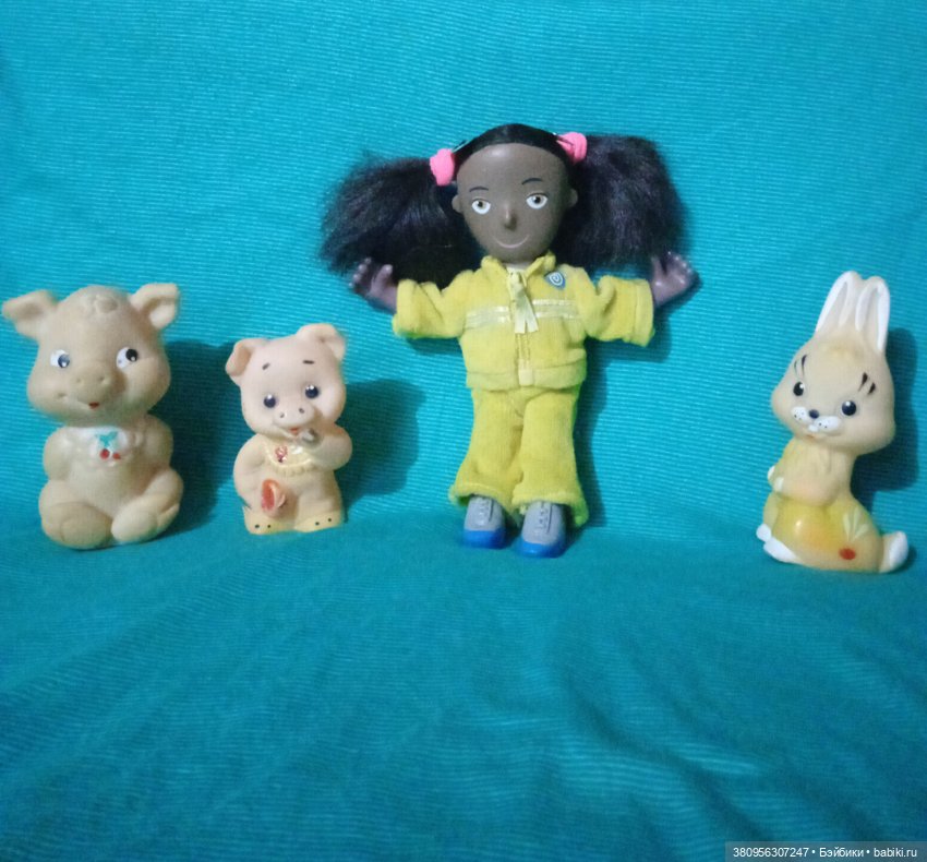 Выздоровевших встречает маленькая темнокожая куколка Josie Jump по мотивам британского телесериала Balamory, с питомцами производства СССР, свинкой Розочкой, поросёнком Хрюшей и зайкой Степашкой, клейм у игрушечек нет, может кто ни будь и подскажет кто выпускал такие игрушечки.