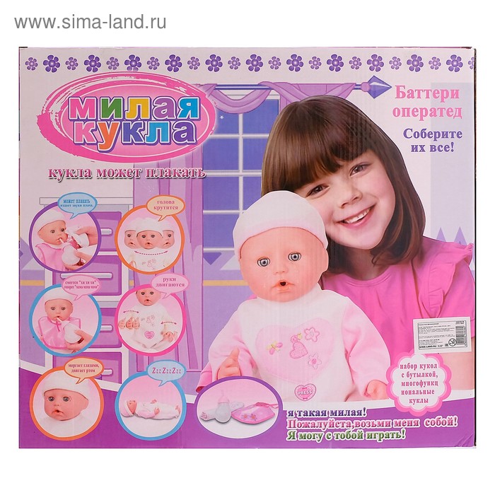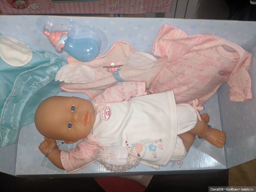 А ещё под этой же маркой выпускали что-то на подобие подделки на куклу Беби Анабель 4 версии. С чего я так решила — очень похоже оформление костюмчика, молд лица, форма бутылочки почти копирует оригинал, есть поворот головы, и судя по всему, функция слёз.