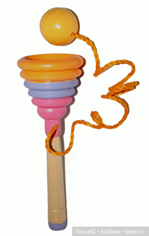 Это разновидность бильбоке — с привязанным кружком, который подкидывают и надевают на остриё.