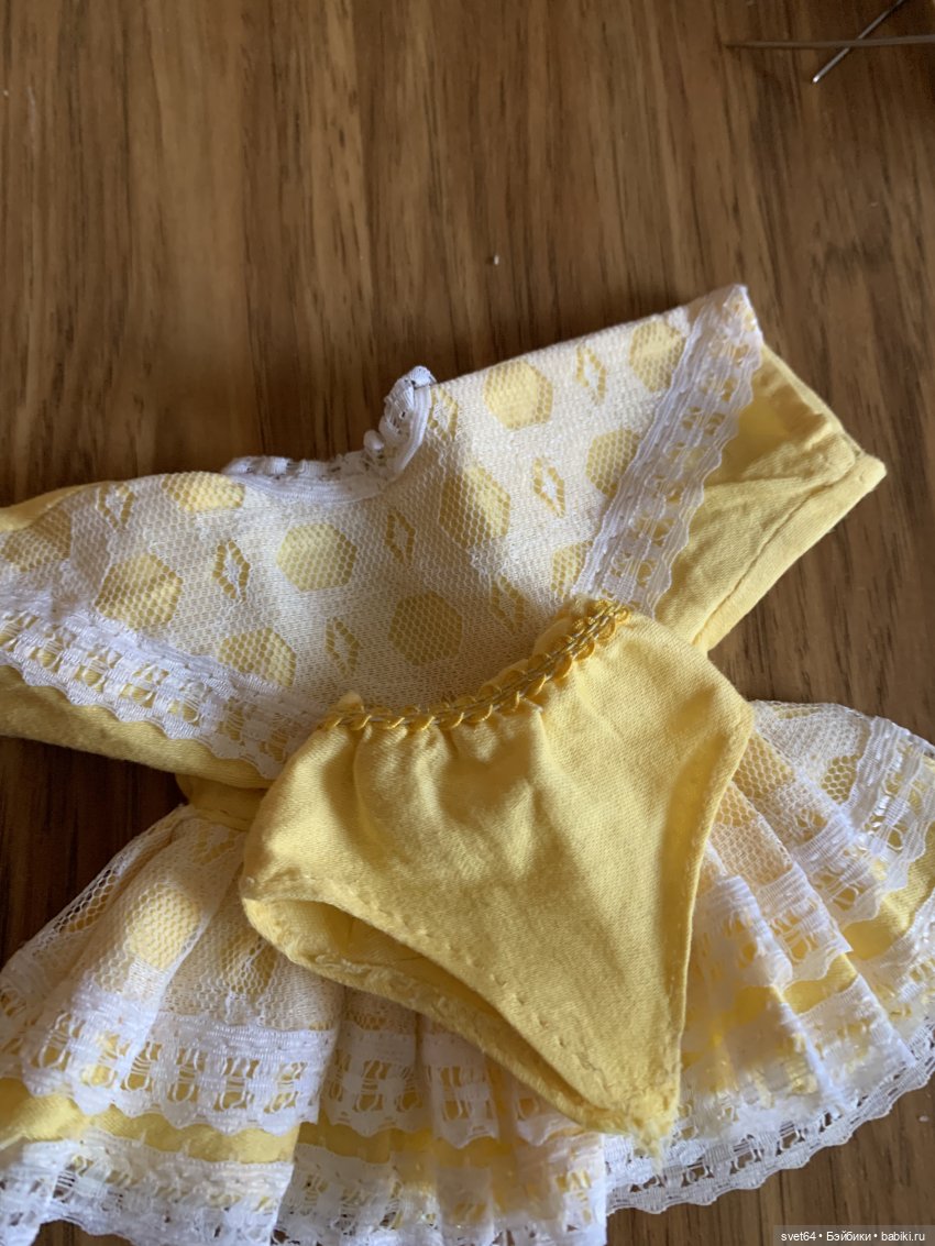 Похожа? Этикетки не было, покупала на блошке. Желтенькое коротенькое платьице. И такие же трусики.