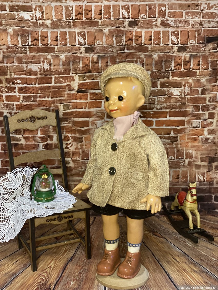 Кукла из ранних, еще не шарнирное тело, просто пришитые ноги и руки. Но конечности уже из прессопилок, не набивные. Делаю вывод, что куколка от 1948 до 1950 годов выпуска. Так же форма ботинок упрощенная, глазки рисованные, два зубика во рту. Форма прически на затылке и у шейки сглаженная, более ровная.