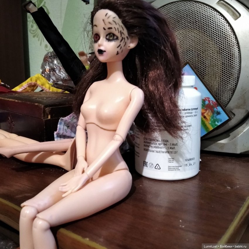 Я её, то есть, не доделал, там где черточки надо чёрные стразы налепить, и они у меня даже есть, но оно все мелкое, и клеить я ненавижу, вот и отлыниваю. Но по ней наверное уже видно, что она не совсем живая. Она изначально ко мне попала со смытым лицом и на другом теле, то когда-то была маленькая модница из фикспрайса. Дети поиграли.
